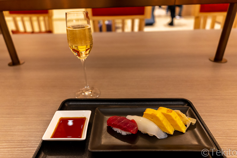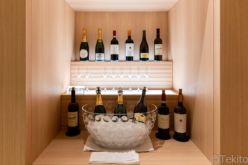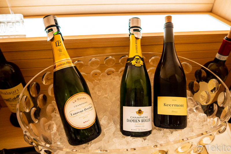 ビジネスクラスラウンジ相当のサクララウンジだとスパークリングワインしかありませんが、ファーストクラスラウンジではシャンパンあり。サクララウンジとは違いを感じます。