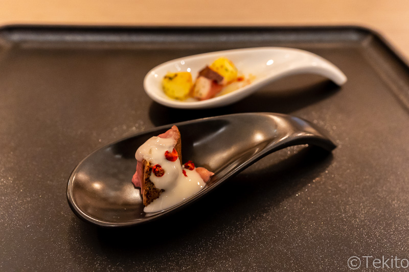 一口サイズのお上品なローストビーフと、蛸とポテトのピンチョス。貧乏性の庶民としては、もっとボリューミーな方が良いのですが、ここはファーストクラスラウンジ。仕方ありません。