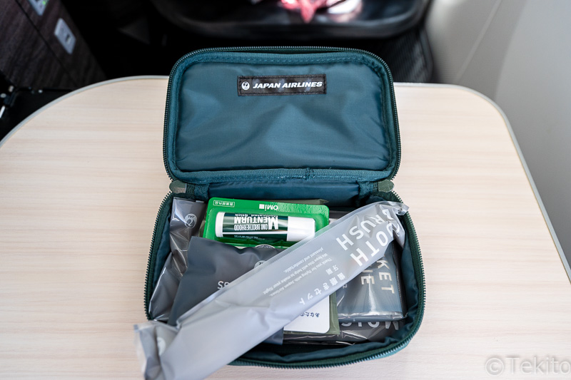 ビジネスクラスだとアメニティーポーチにも歯ブラシが入っているので、フライト中盤でも売り切れてません。