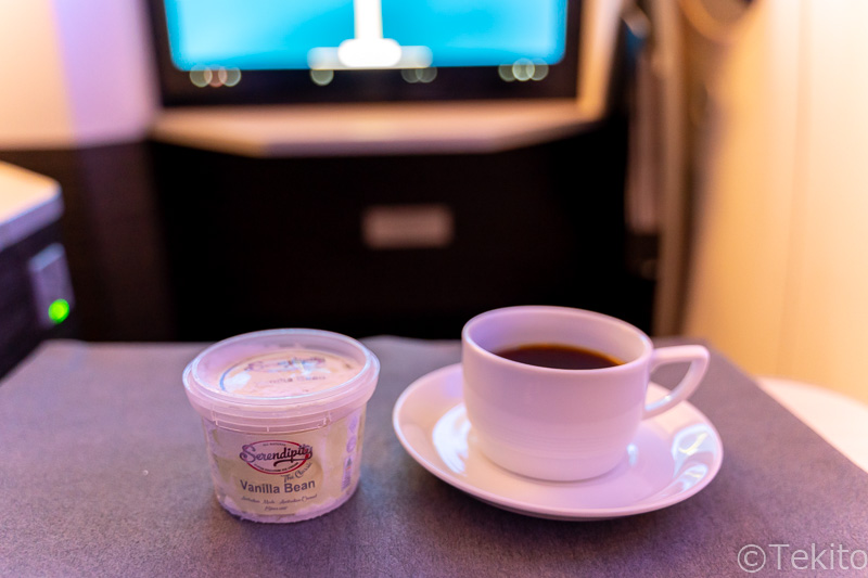 着陸の90分前になると、CAさんはラストオーダーを取り始めます。全くお腹は空いていないので、軽めのアイスクリームとコーヒーをオーダー。