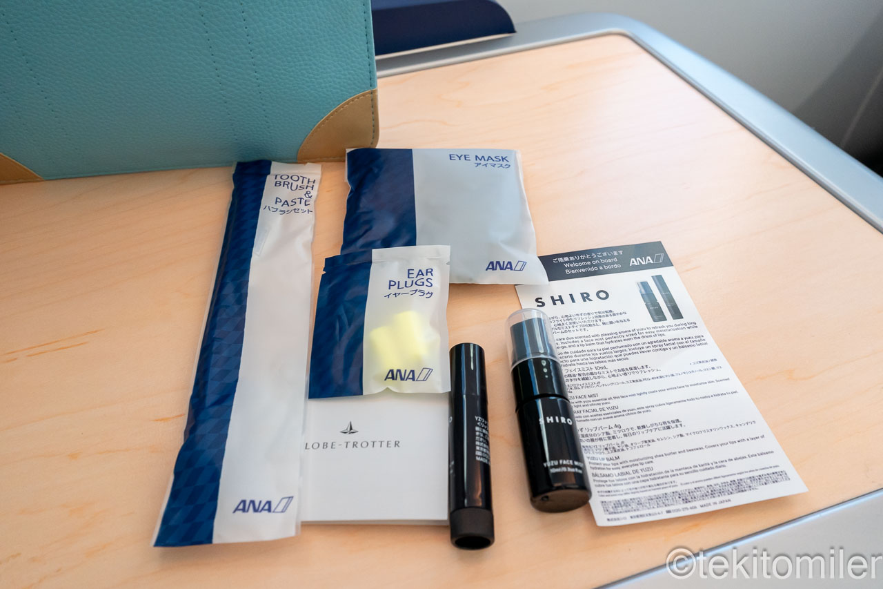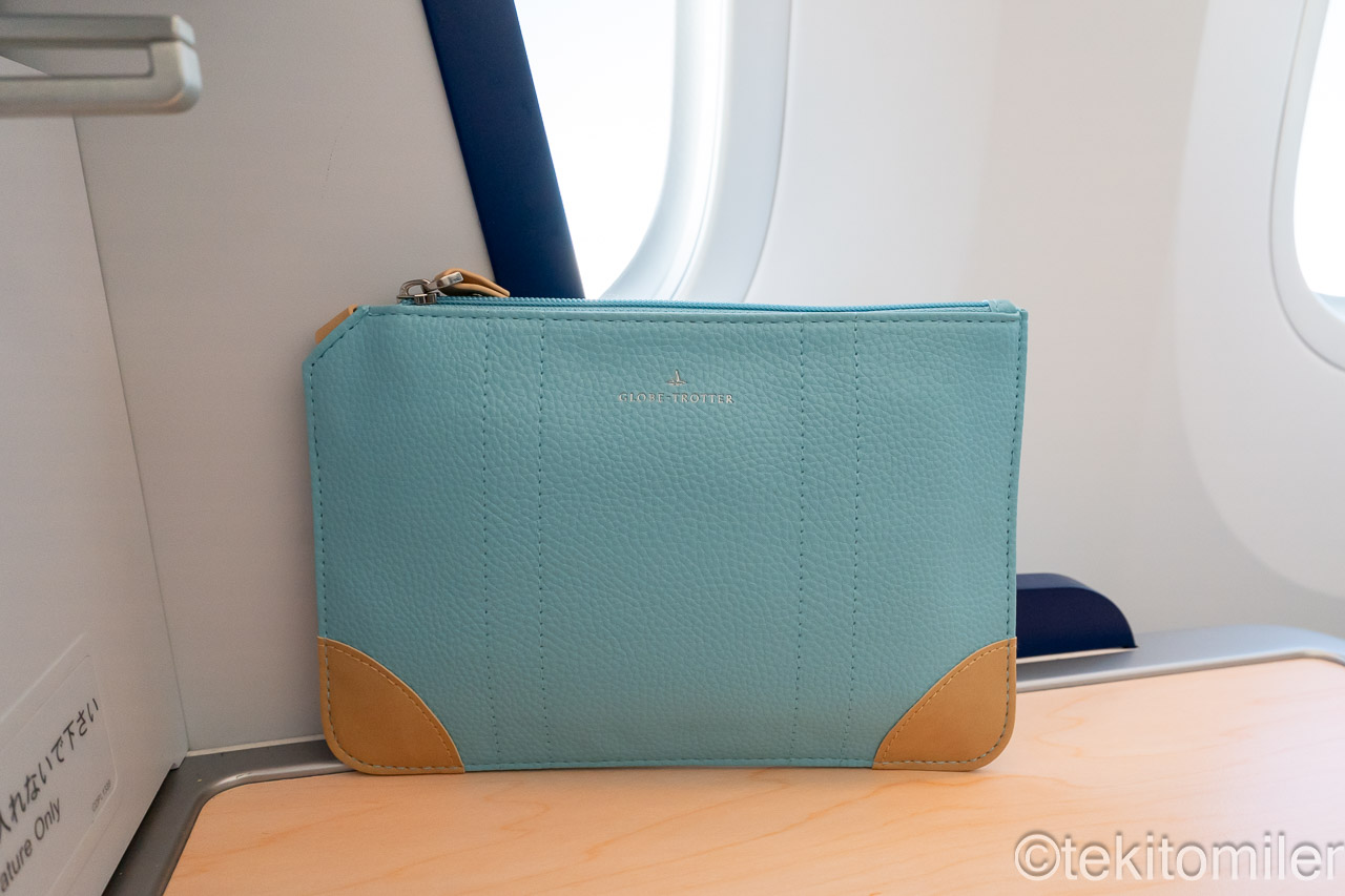 各シートにはアメニティーが用意されています。長距離国際線で共通のアメニティーキットです。