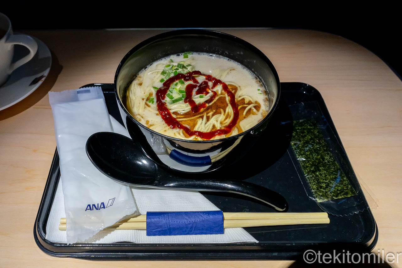 機内に充満するとんこつラーメンの香りは威力抜群。私が注文すると連鎖して周りの乗客も注文してました。