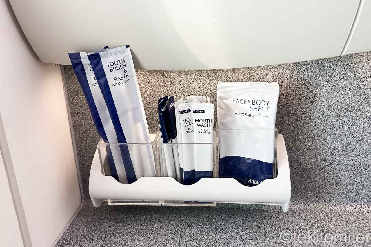 ビジネスクラスだとアメニティーキットに歯ブラシが入っていますが、ラバトリーにも歯ブラシが置いてあります。
