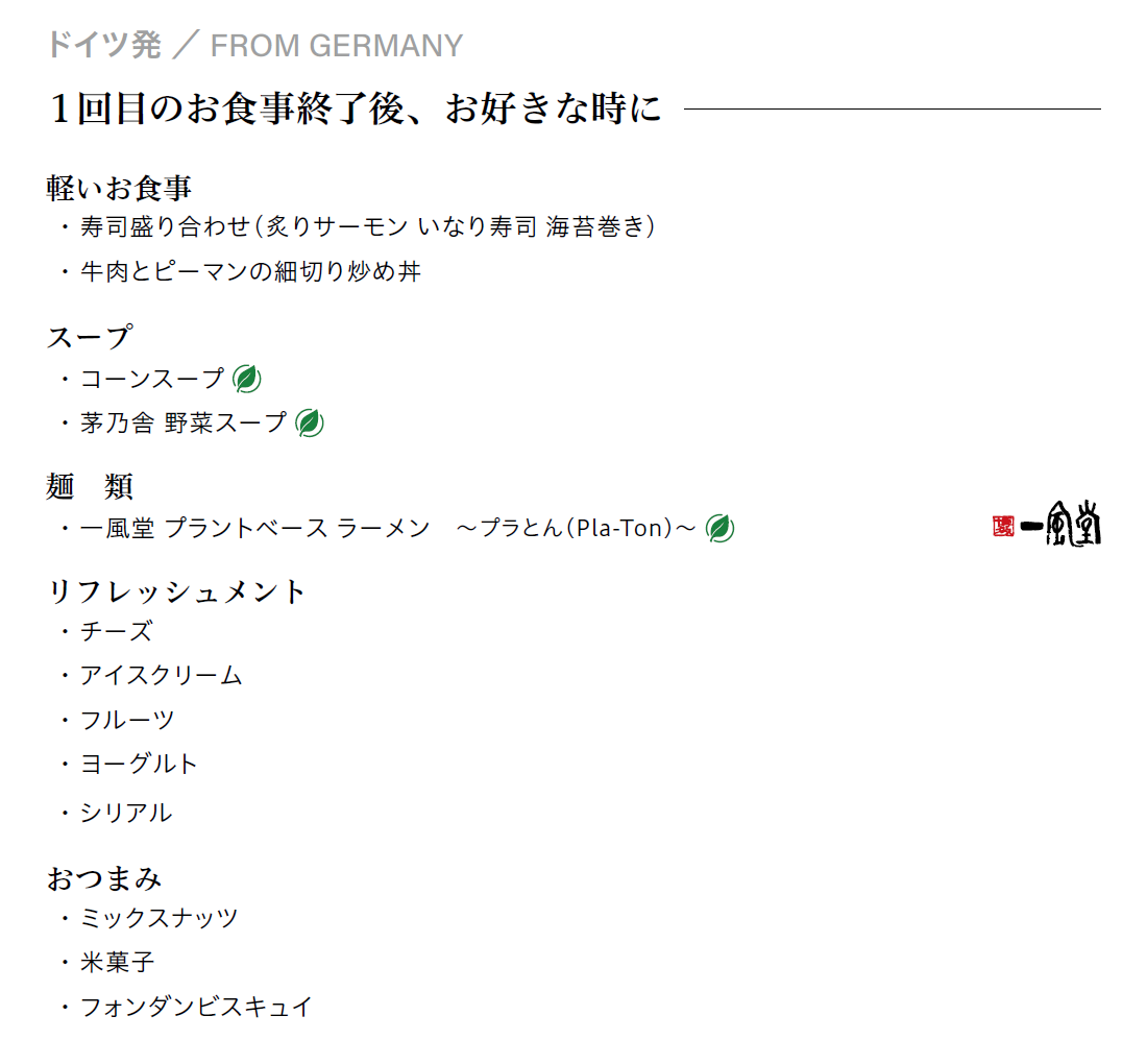 - 離陸後の機内食の後、好きなときに注文できる軽食