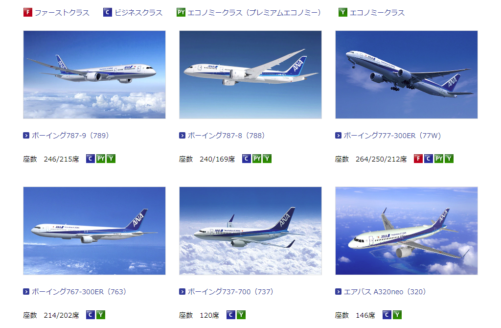 スナップショットとして、この記事を書いている2017年12月時点のANA国際線機材一覧を載せおきます。
