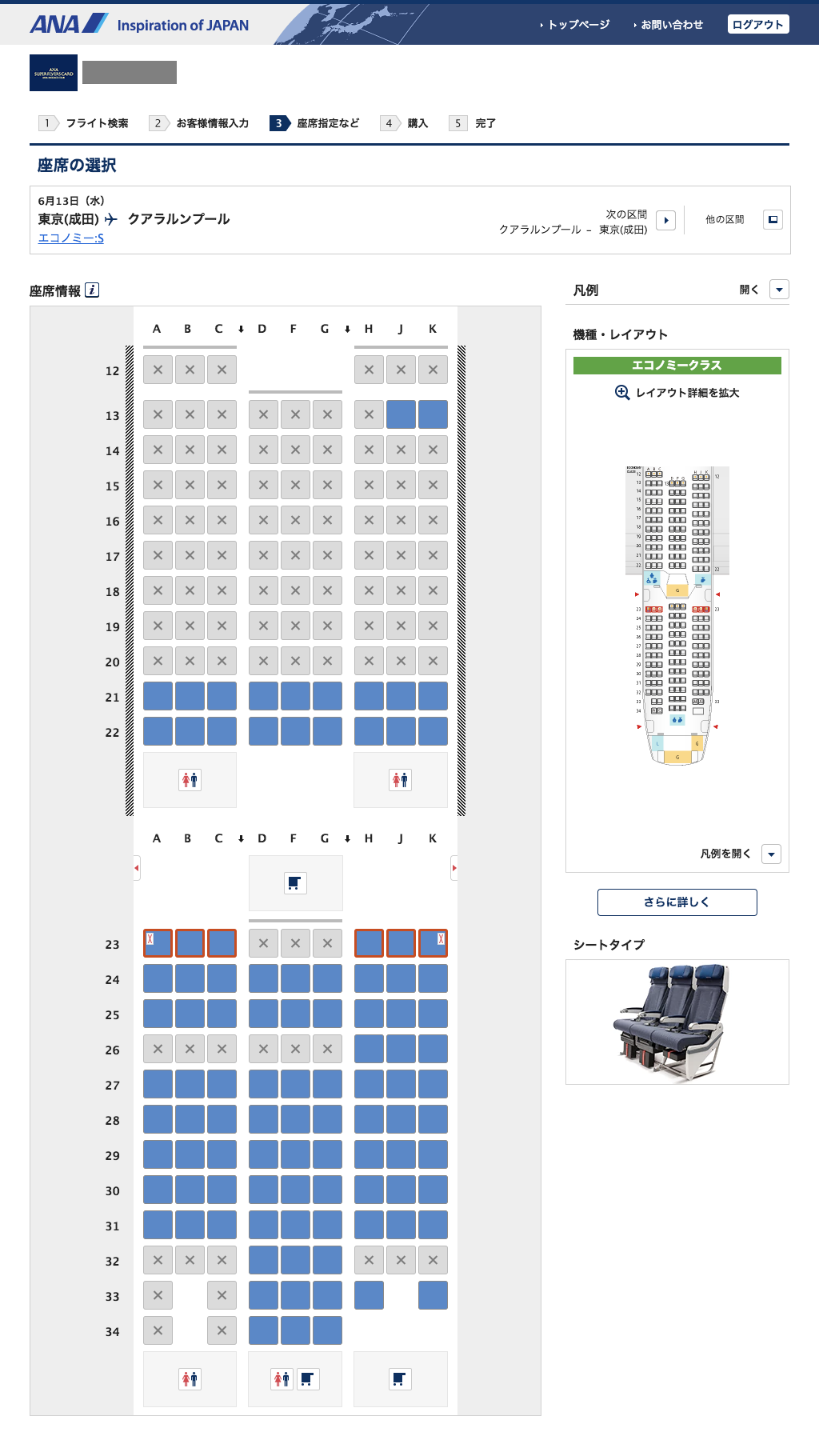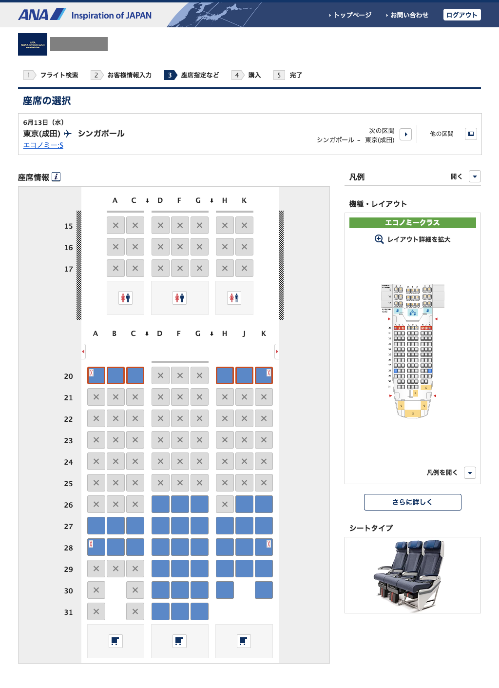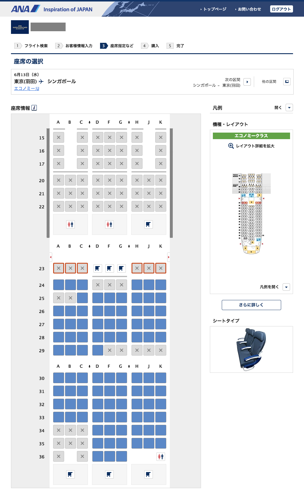 分かった事2:上位の予約クラスだと指定可能な座席は広がるが、非常口席の指定には影響しない。