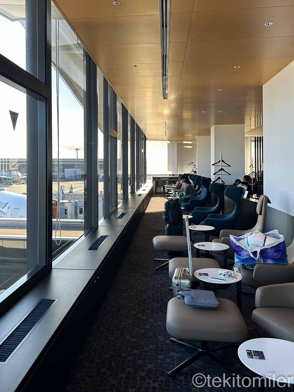 大きな窓が一面にあり、開放的な空間に仕上がっています。ラウンジ全体の雰囲気は、ANAラウンジと同じ感じです。