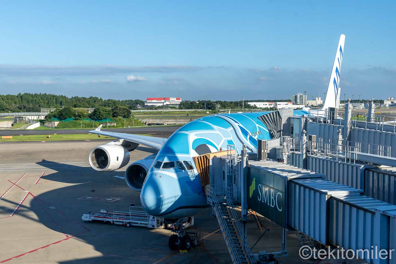 二階建てのA380に対応している54番ゲートの正面なので、午前中や夕方以降になると、フライングホヌを間近で見ることができます。