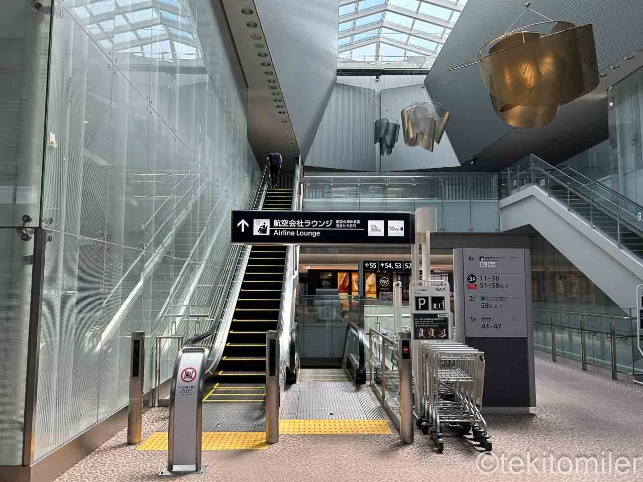 2-3分程度歩くと、ANAスイートラウンジと併設されているANAラウンジにアクセスするためのエスカレーターが見えてきます。