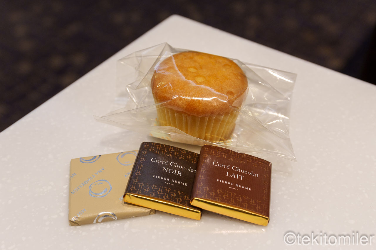 ANAラウンジにあるスナックだけでなく、ピエール・エルメのチョコなども提供されています。