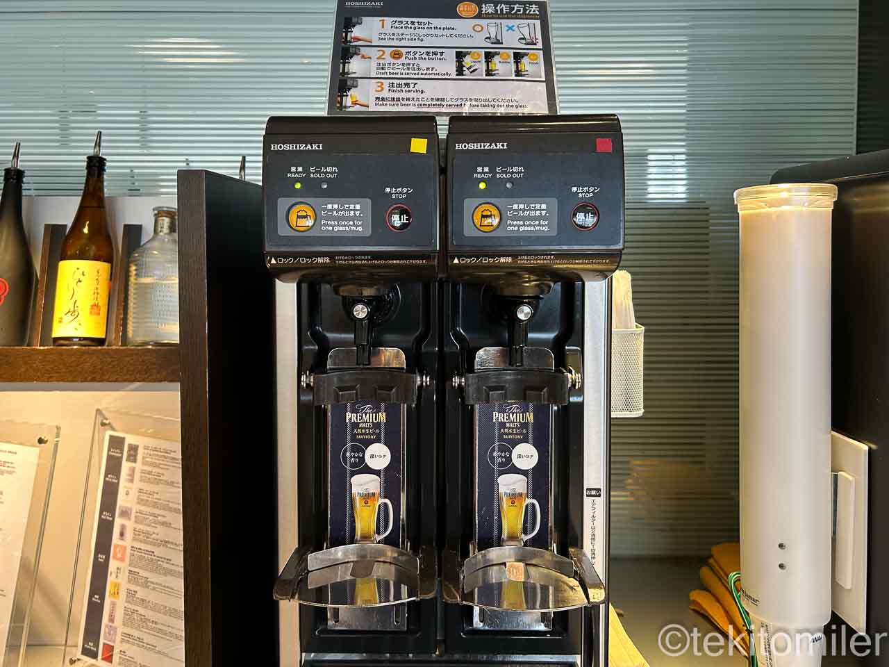 生ビールはプレミアムモルツ。ANAラウンジのビールはスーパードライや一番搾りなので、差がつけられています。