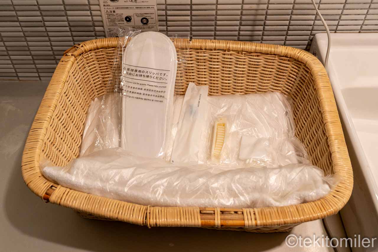 シャワールームには、使い捨てスリッパ、歯ブラシ、クシ、コットン(綿棒入り)、タオル、ひげそりやコーム(平たいクシ)が用意されています。