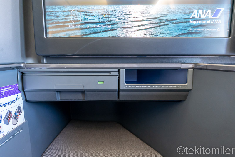 横幅がとっても広いです。エコノミークラスのほぼ2列分の幅を利用しているので、ANAの従来のビジネスクラスよりも、圧倒的にゆったりとしています。もやはビジネスクラスというより、ファーストクラスに近い感覚です。
