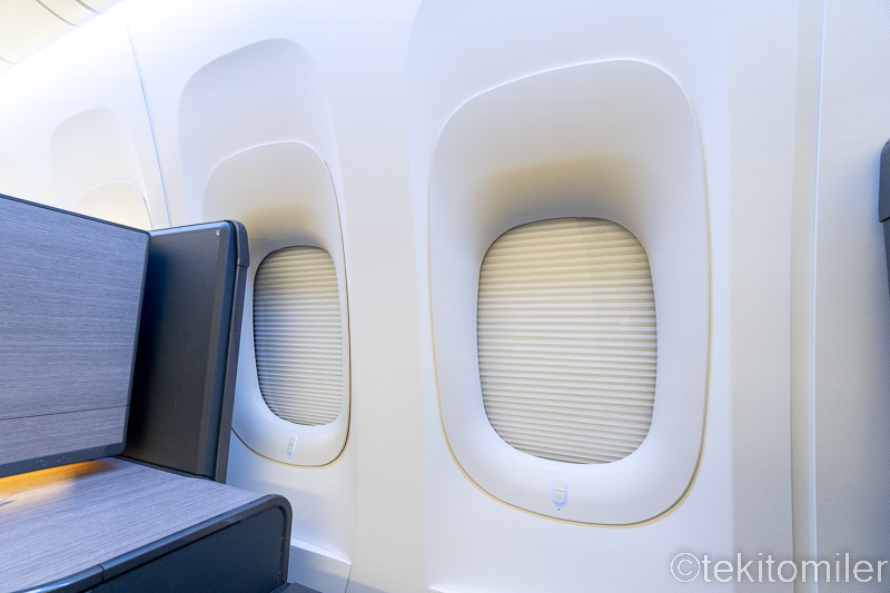 シェードは電動です。ファーストクラスとビジネスクラは電動シェードになっているようです。プレエコとエコノミーは従来の手動で開閉するシェードです。