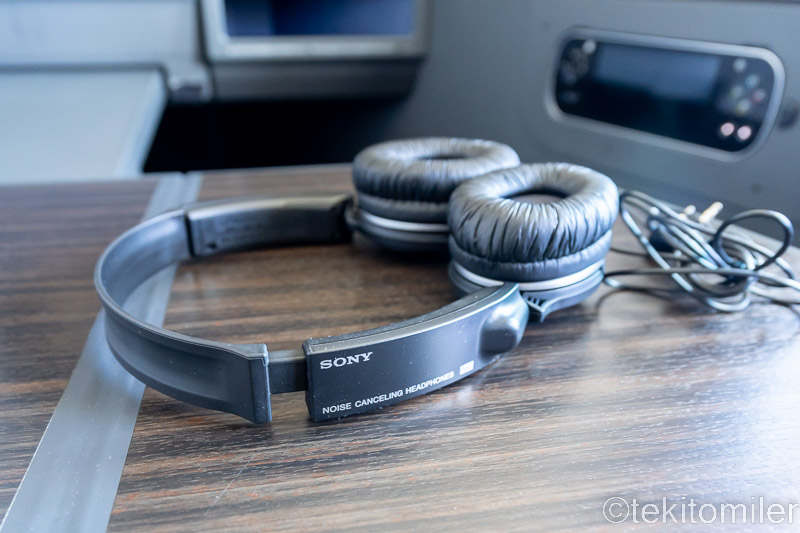 ベッドフォンはソニーのノイズキャンセリングタイプ。普段ノイズキャンセリングベッドフォンを使わないので、性能が良いのか悪いのか判断できませんが、それなりに飛行機の騒音が聞こえます。