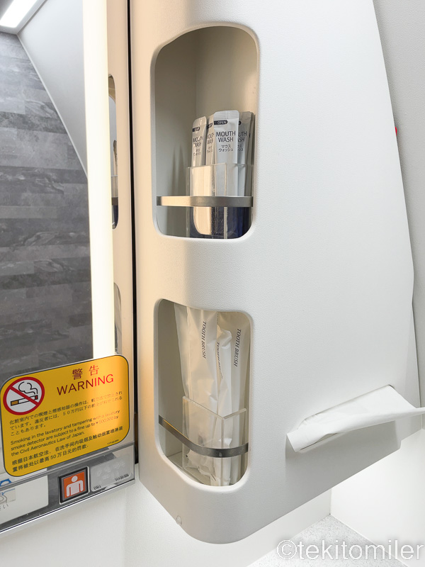 ラックには歯磨きセット、マウスウォッシュが常備されていました。歯ブラシはフライト中に補充されていないようでした。着陸が近くなると、歯ブラシは残り1本になっていました。