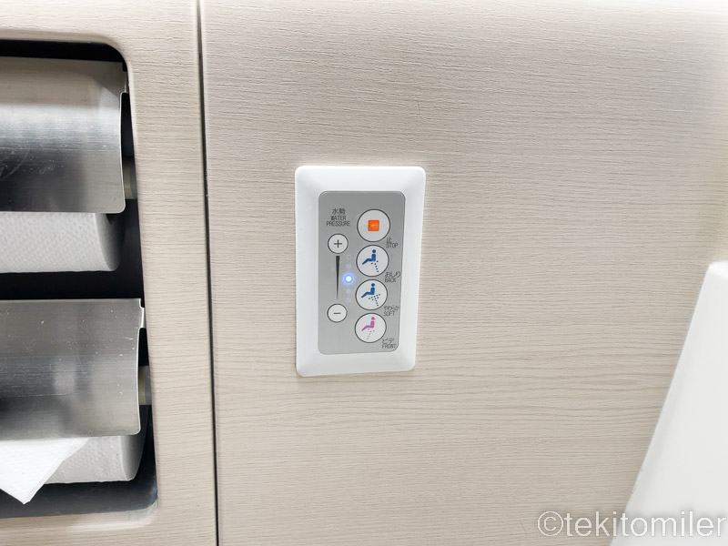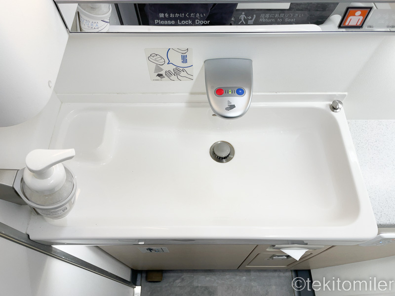 便座にはウォシュレットが付いています。ウォシュレットはB787だけかと思っていましたが、改装済みのB777-300ERにも付いているようですね。