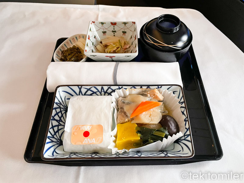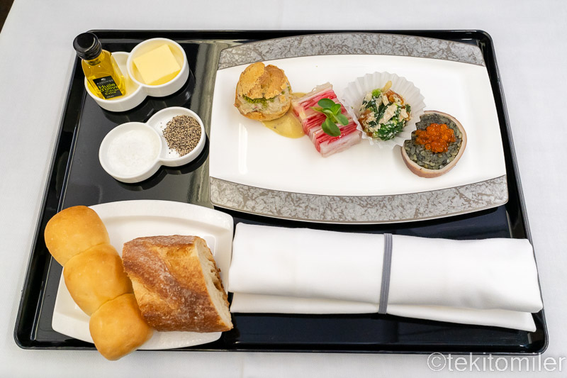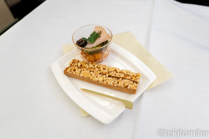 まずはアミューズから。アミューズは洋食と和食で共通です。最後にANAビジネスクラスに搭乗したのは3年くらい前ですが、そのときもANAオリジナルスティックを食べた気がします。