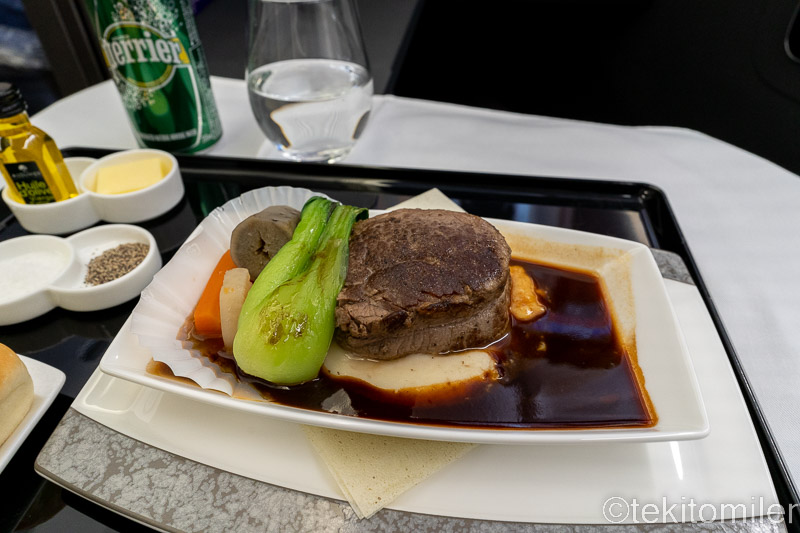 メインディッシュは牛フィレ肉。上空で食べるステーキは至福の時間!