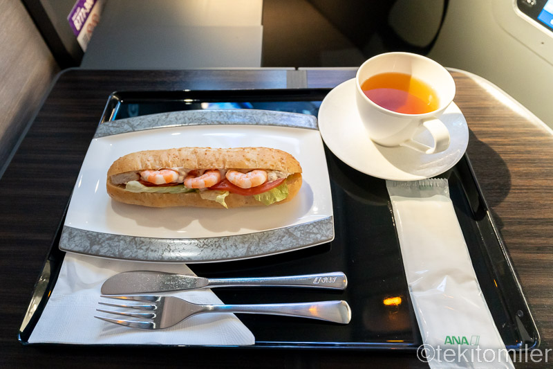 今回は洋食をチョイス。機内食のメニューは、ANAホームページで公開されているメニューを載せています。THE Roomだからと言って特別な機内食ではなく、ヨーロッパ路線のビジネスクラスと同等のメニューです。