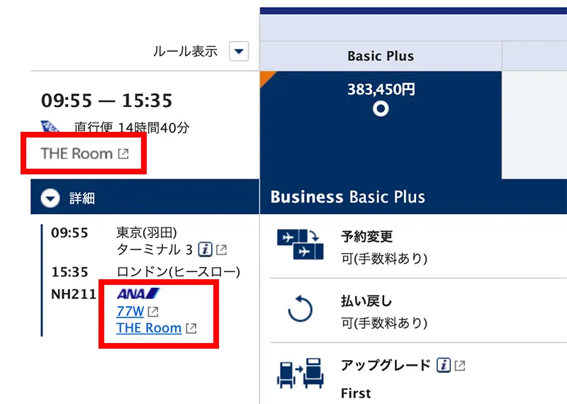 ANAホームページからフライトを検索すると、便名の横に、飛行機の機材が表示されています。ここに「THE Room」の記載があれば、THE Room対象便であることがわかります。