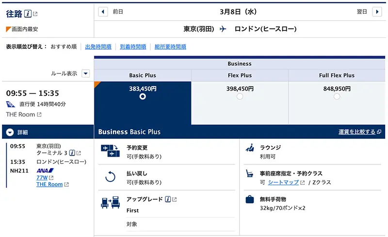 | フライト | 往路:NH211 東京/羽田(HND) → ロンドン/ヒースロー(LHR) 復路:NH212 ロンドン/ヒースロー(LHR) → 東京/羽田(HND) |