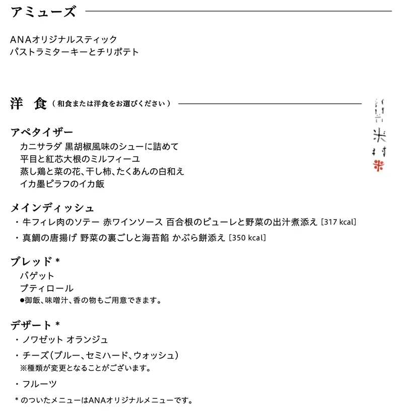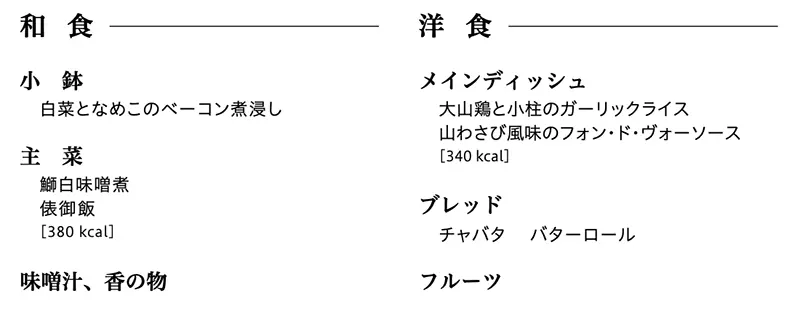 メニューは和食と洋食から選択できます。離陸後の機内食と比較すると、軽めの機内食です。