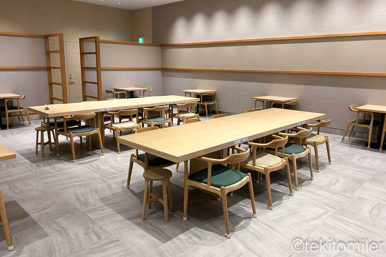 ビュッフェカウンターの隣のスペースには、食事をするためのテーブル席があります。