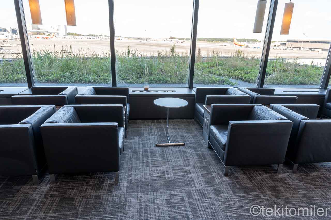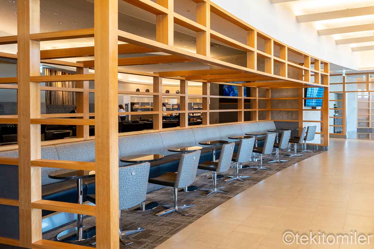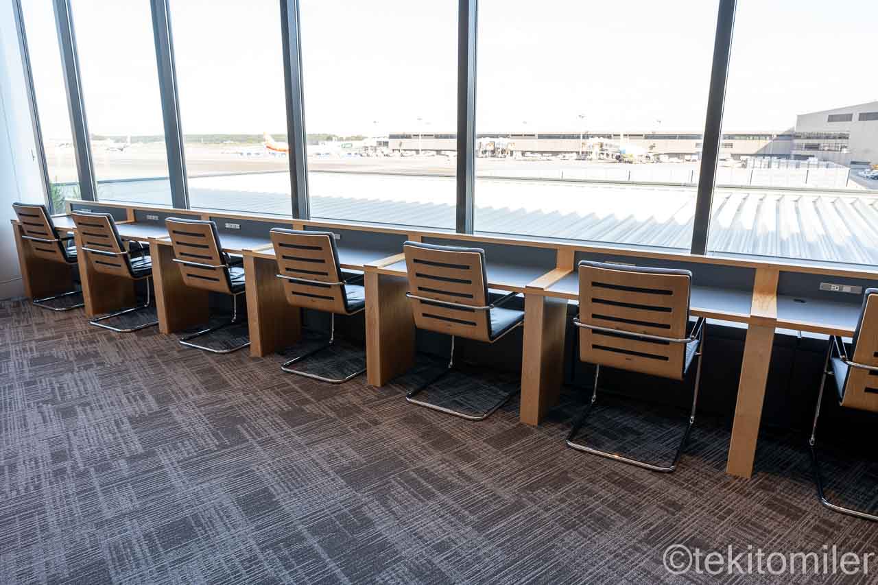 ラウンジエリアの一番奥にあるカウンター席。滑走路側に面しているため、景色はなかなか良いです。デスク上に電源があるので、PC作業にも最適です。
