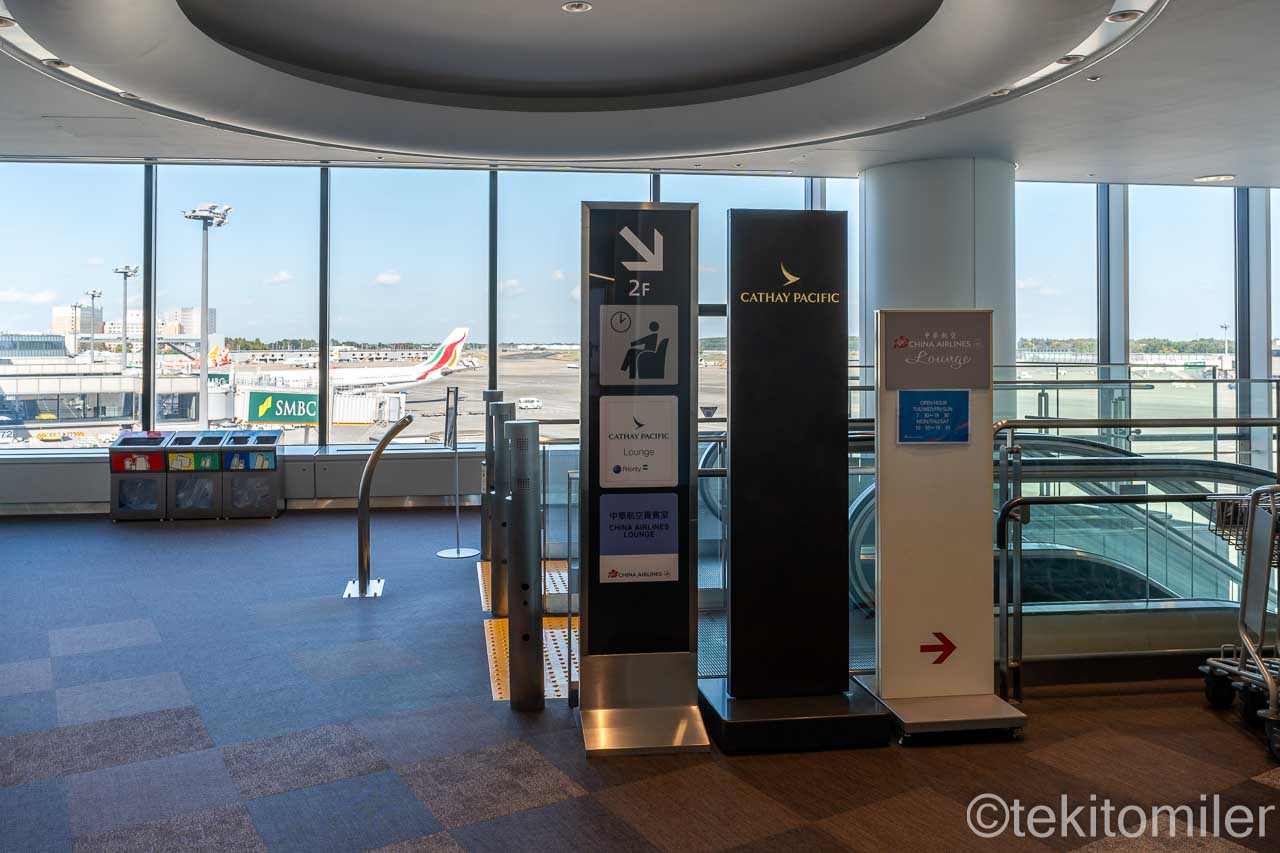 エスカレーターを降りると、正面にキャセイラウンジのエントランスがあります。