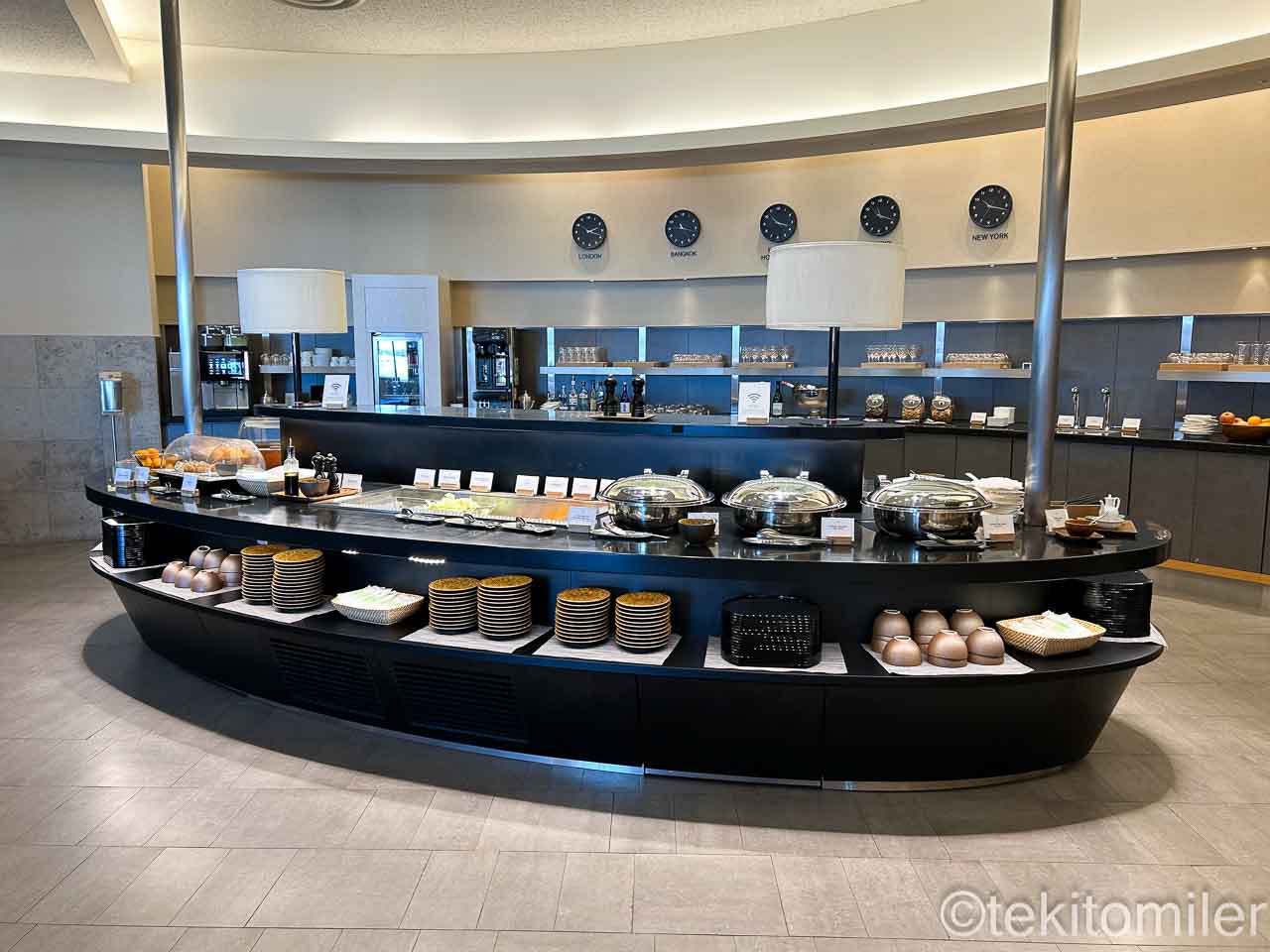 キャセイラウンジのダイニングはビュッフェ形式。楕円形のビュッフェカウンターで、料理ややデザートなどが提供されています。