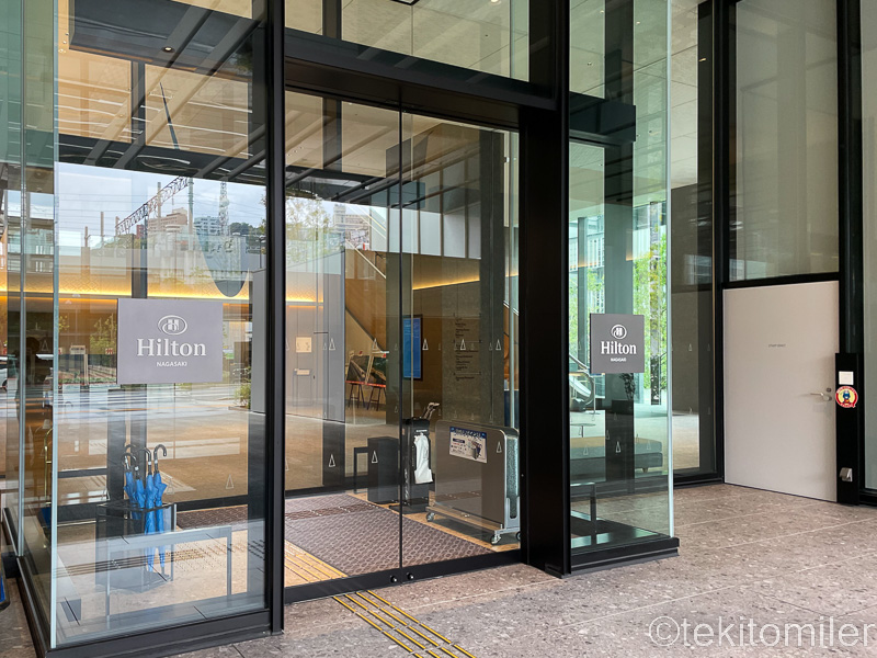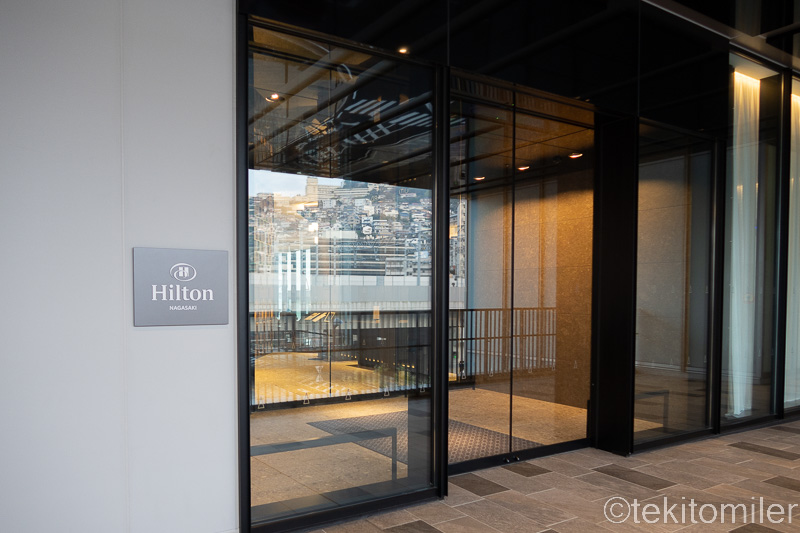 横断歩道を渡って右手に行くと、ヒルトン長崎の看板ともに、エントランスが見えてきます。