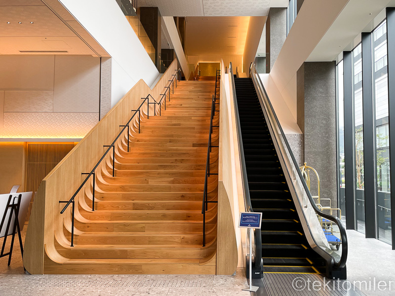 1階のエントランスからアクセスすると、2階に上がる階段とエスカレーターがあります。