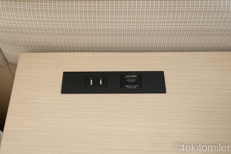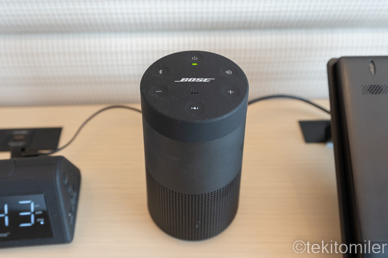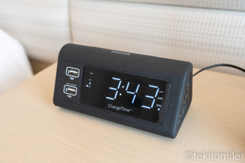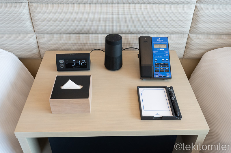 ベッド間のテーブルには、電話、目覚まし時計、Bluetoothスピーカー、コンセント、USBポートを完備。