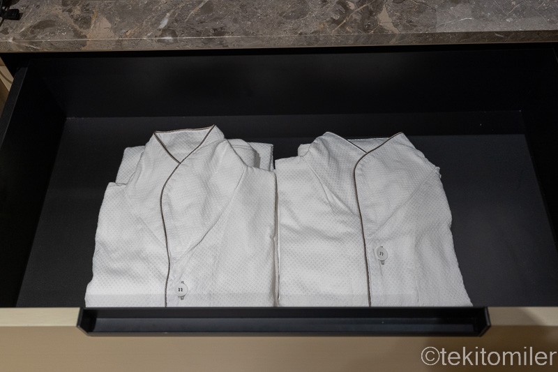 荷物置きの下は引き出しになっていて、パジャマとバスローブが入っています。