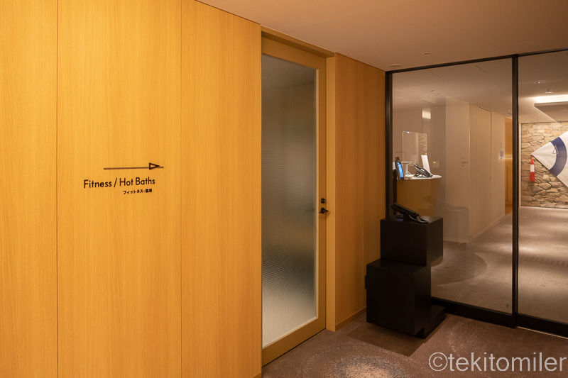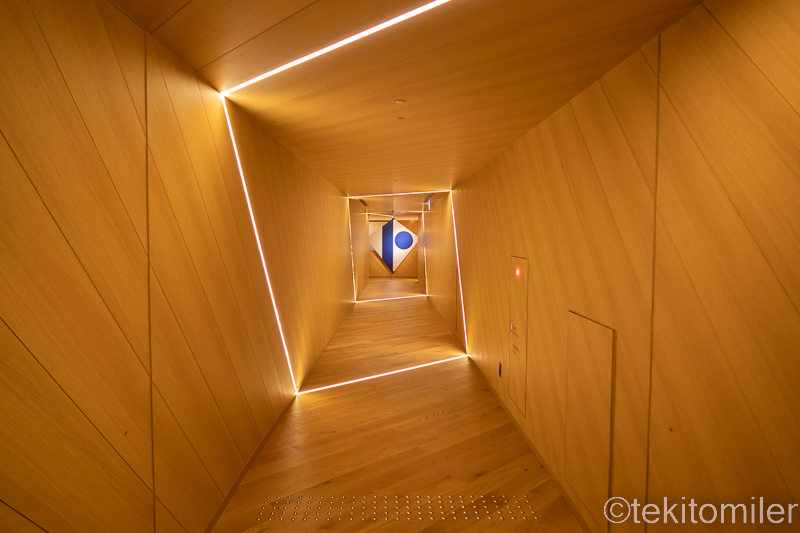 フィットネスルーム・温浴施設に向かう通路は、木目調の床と壁に、レーザーのようなライティングがされていて、かなりオシャレ。