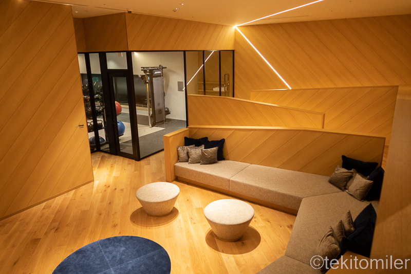 フィットネスルームと温浴施設の入口にはソファーがあり、寛いだり、待ち合わせに使えるようになっています。