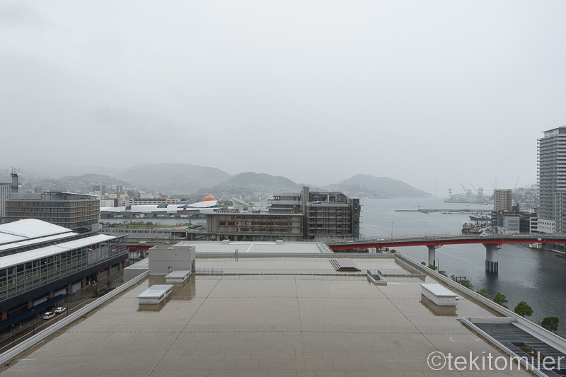 正面は出島メッセの屋根、右側が長崎駅。思いっきり、眺望に入り込んできます。
