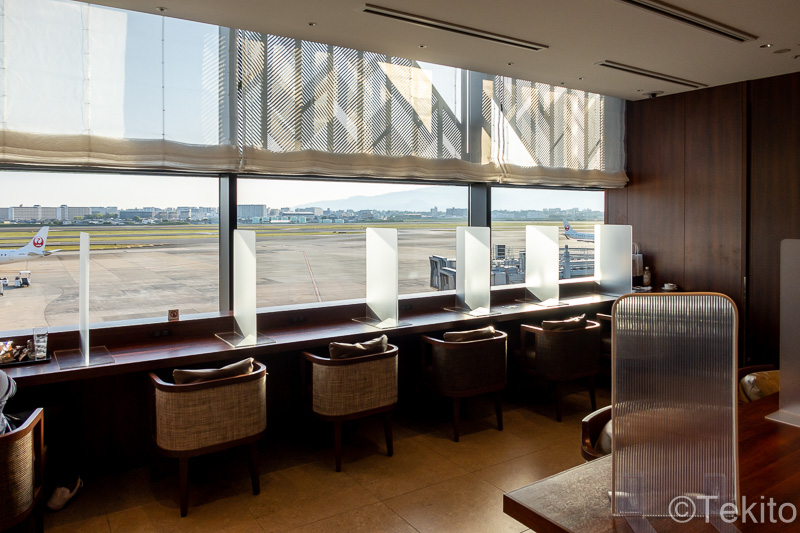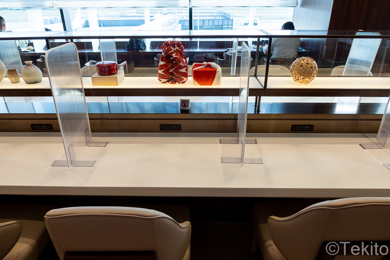 滑走路に面した窓側のカウンター席や、ラウンジ中央の横長のカウンター席があります。