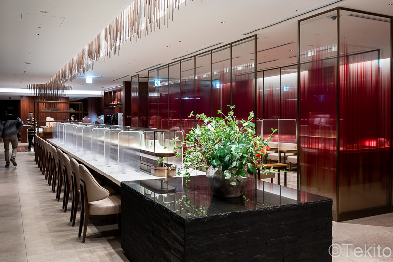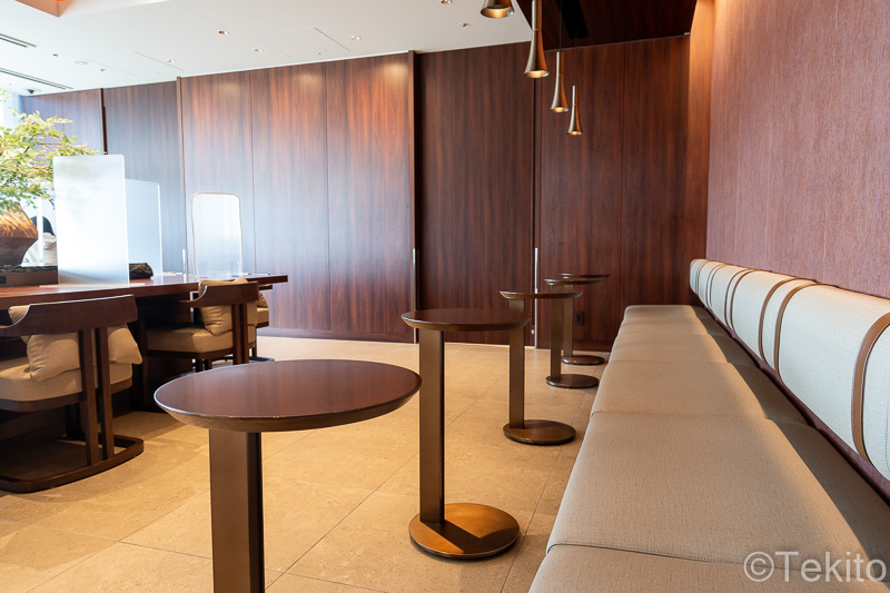 ラウンジに入ると、左右にカウンター席やソファー席が配置されたラウンジエリアがあります。右側の奥の方に進むと、ダイニングエリアになっています。