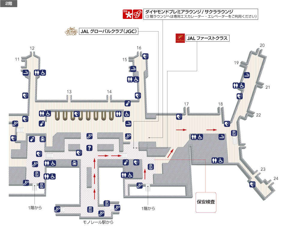 JALダイヤモンド・プレミアラウンジは、北ターミナル2階の制限エリア内にあります。