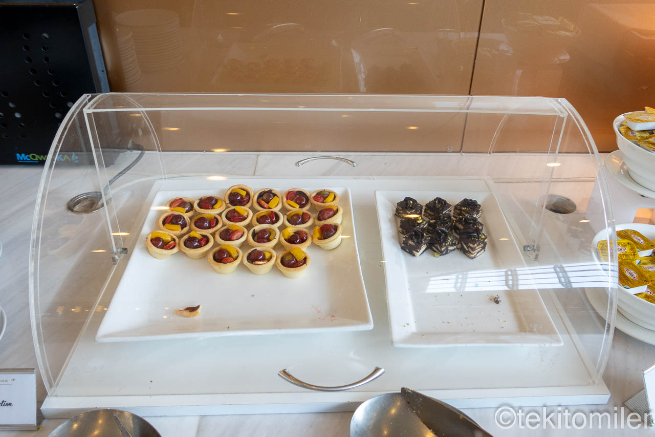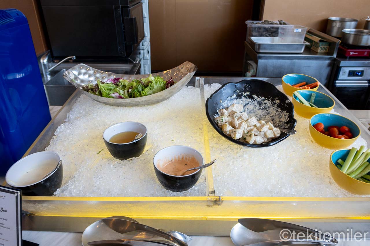 ビュッフェカウンターでは、ホットミール、パン、サラダ、フルーツなどが提供されています。