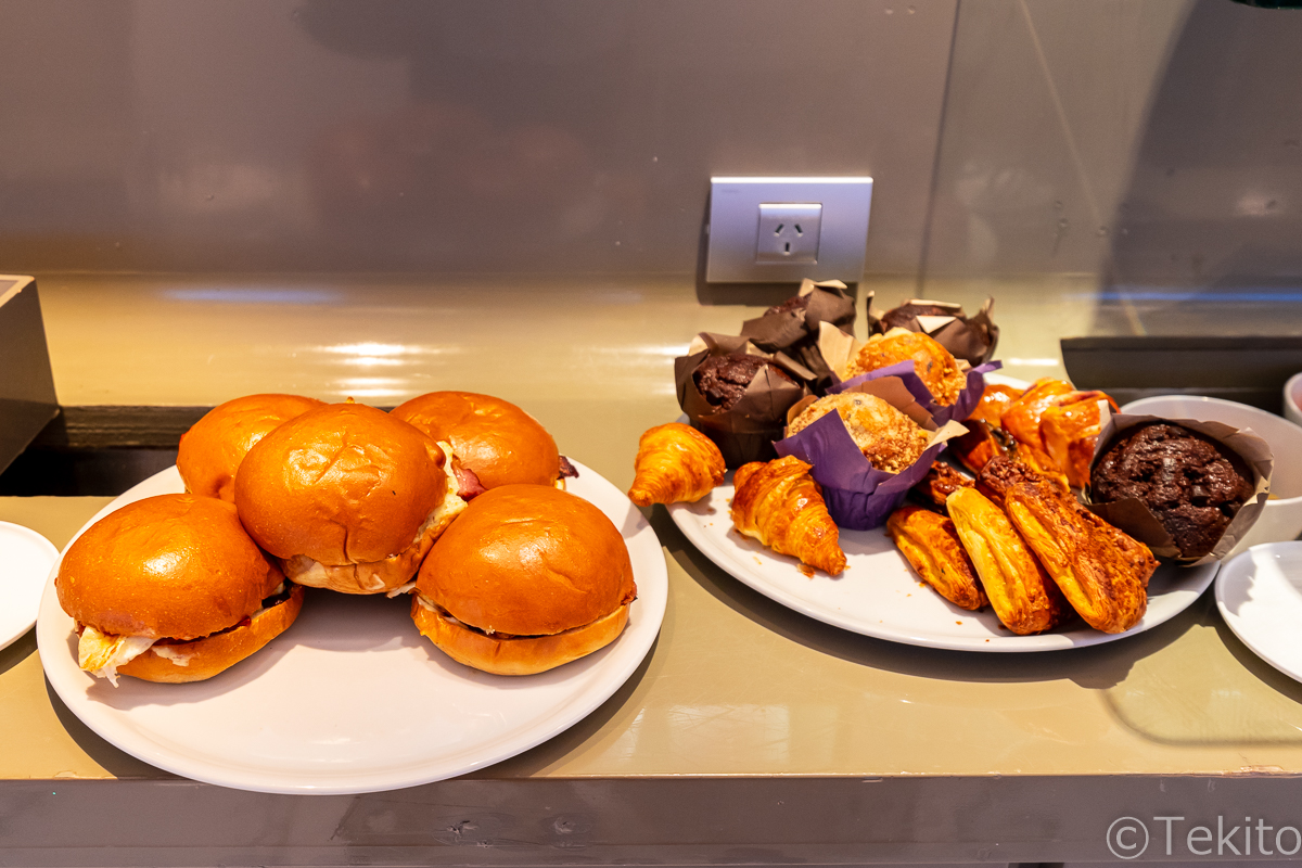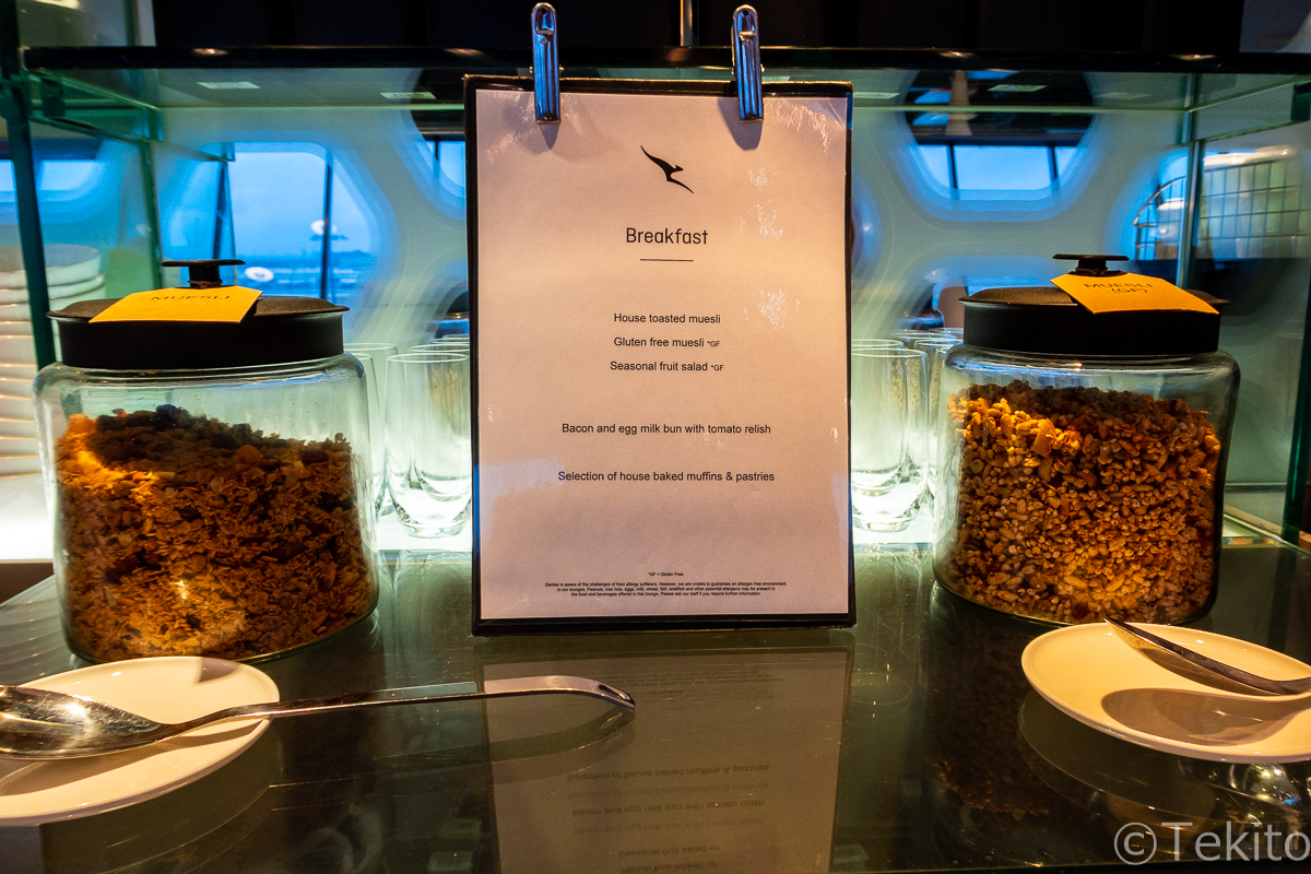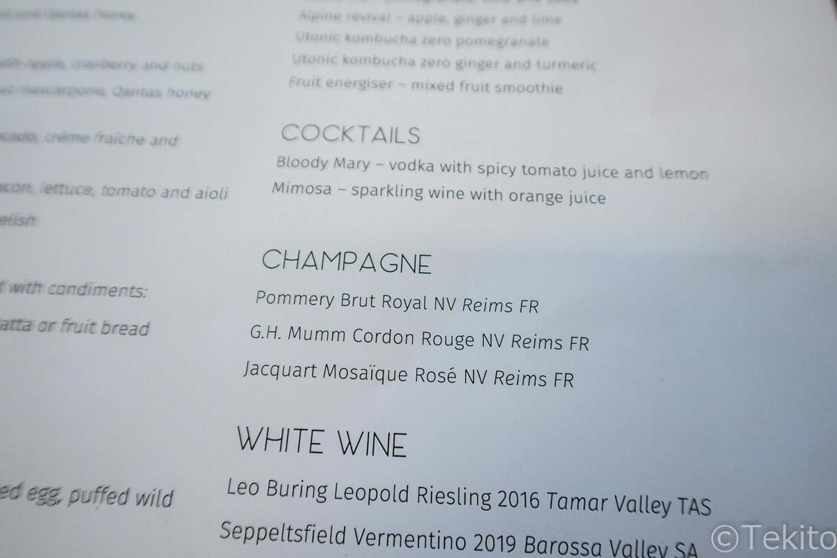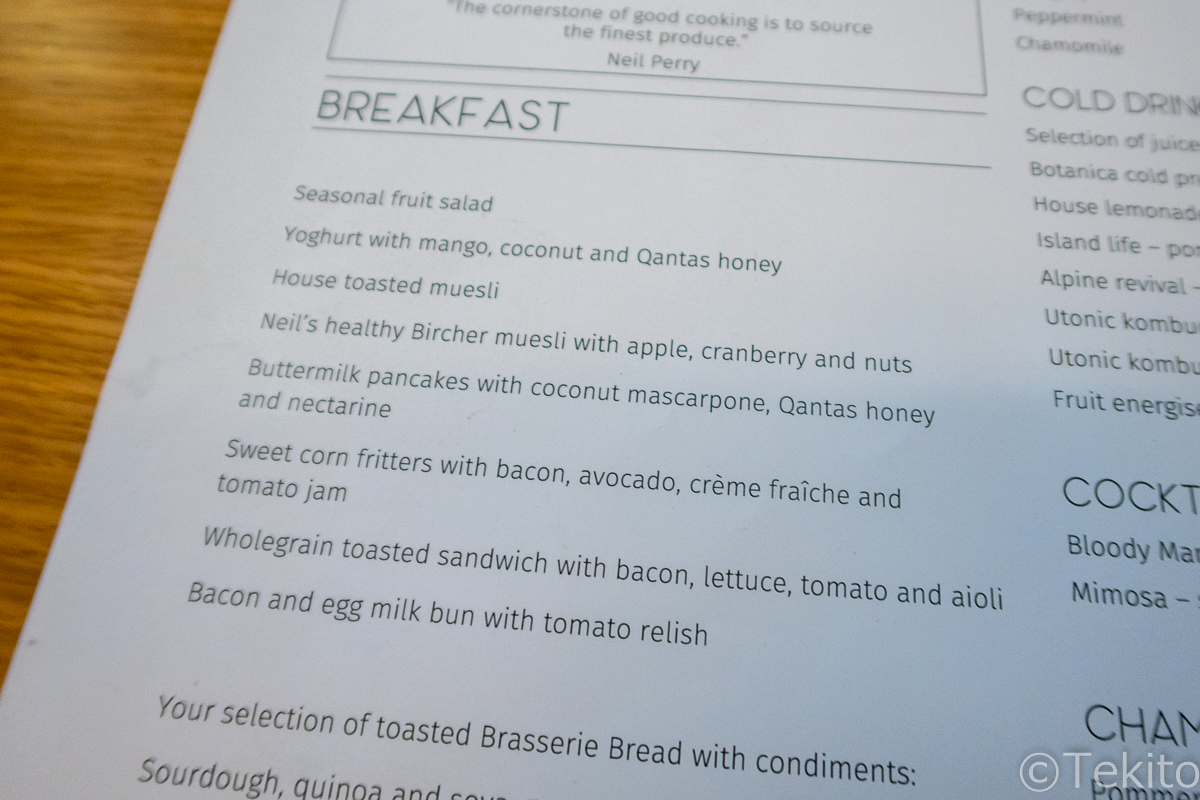 本日のフライトはJL772シドニー→成田です。朝9:00にシドニーを出発します。朝7:00頃にラウンジに入室したので、料理は朝食メニューです。