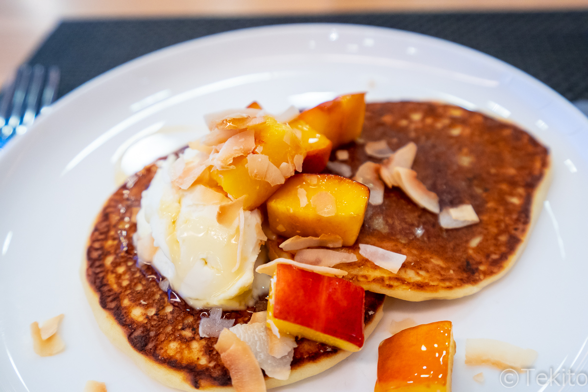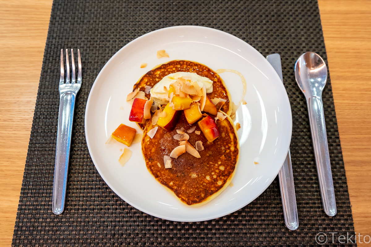 ラウンジの後はJALビジネスクラスの機内食が控えているため、軽めの朝食に。と言う訳でパンケーキをオーダー。